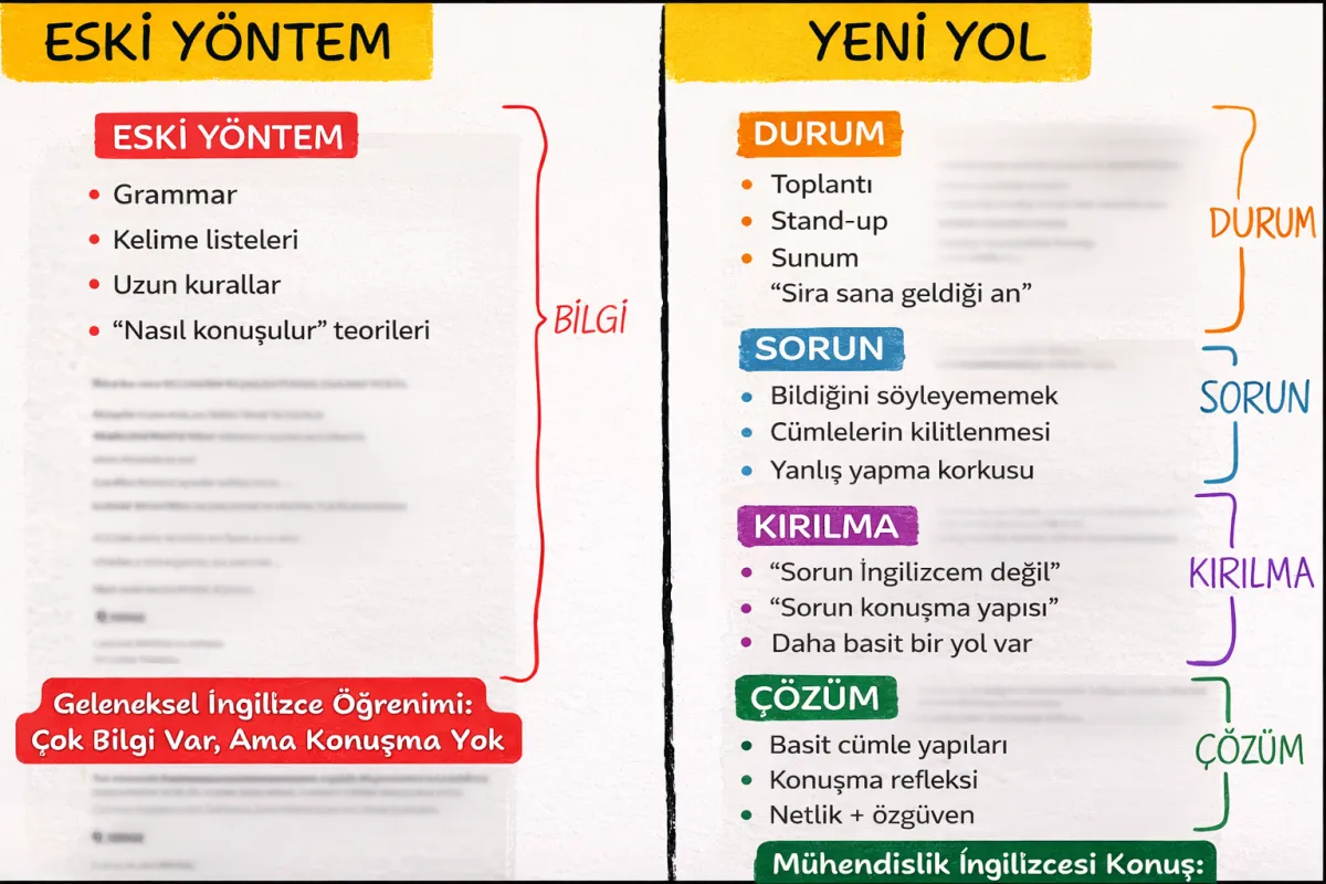 Bu mentörlük, klasik İngilizce kursları gibi “önce bilgi sonra pratik” değil, önce refleks sonra ustalık yaklaşımıyla ilerler.